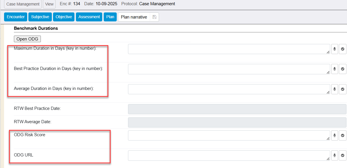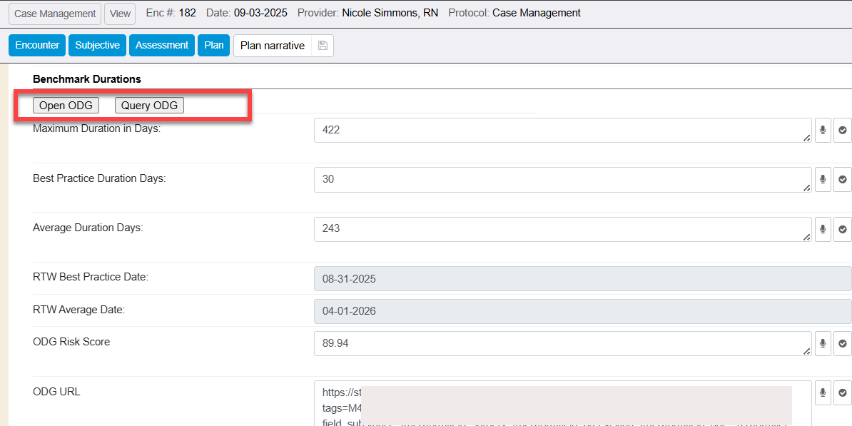 Then you can easily toggle between ODG’s system and your WebChart encounter to manually key in the days for benchmark durations, as well as capture the risk score and url manually.