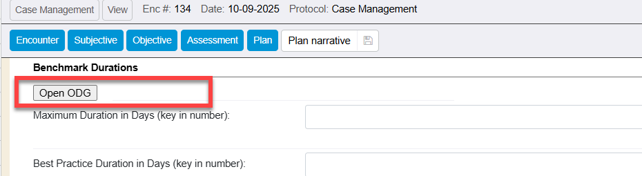 The Open ODG button within the Plan Narrative flowsheet section of a Case Management encounter (utilizing the Chief Complaint protocol of Case Management) will be accessible with or without an ODG integration into your WebChart system.